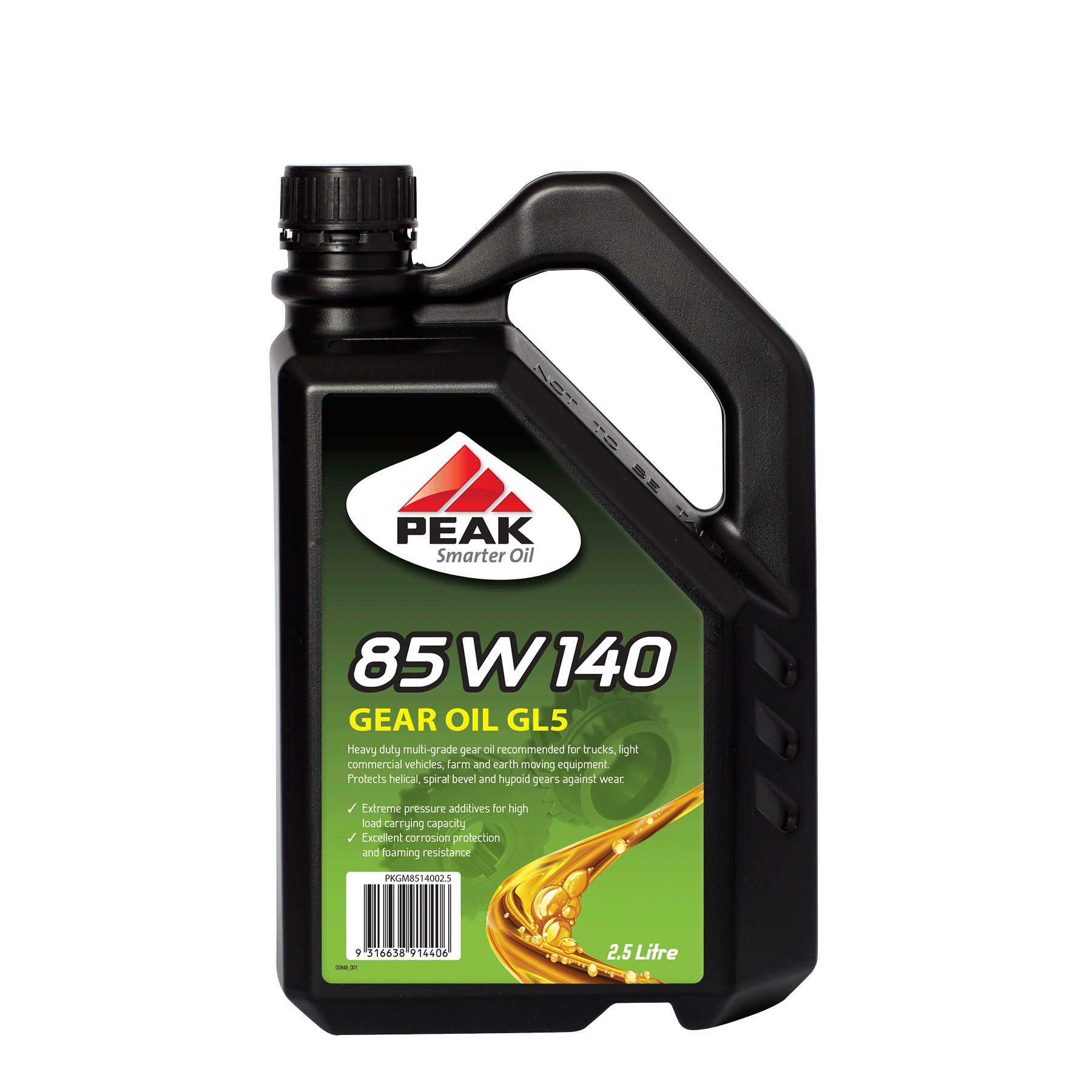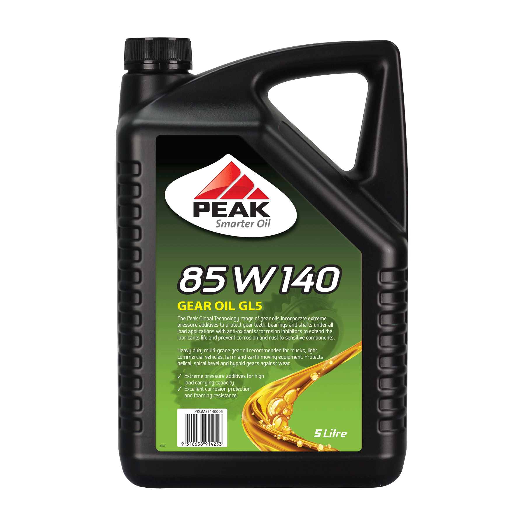 PEAK 85W140 is for use in differentials fitted to modern-day passenger cars and light commercials vehicles, agricultural and industrial applications. It is suitable for gears including helical, spiral bevel and hypoid to minimise scuffing, welding, or galling tooth wear in severe load applications.
