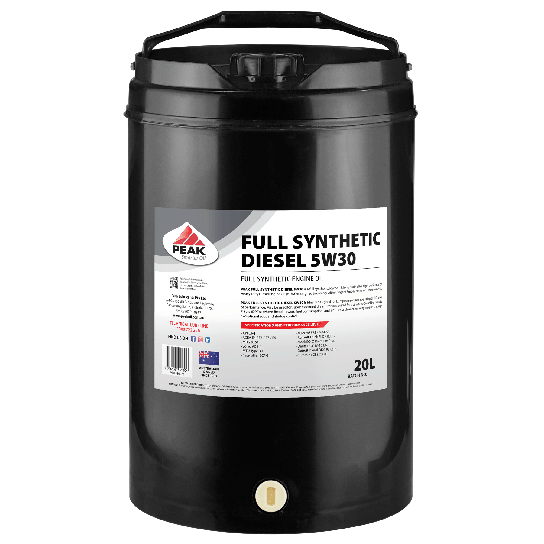 PEAK FULL SYNTHETIC DIESEL 5W30 is a full synthetic, low SAPS, long drain ultra high performance Heavy Duty Diesel Engine Oil (HDDO) designed to comply with stringent Euro IV emissions requirements.