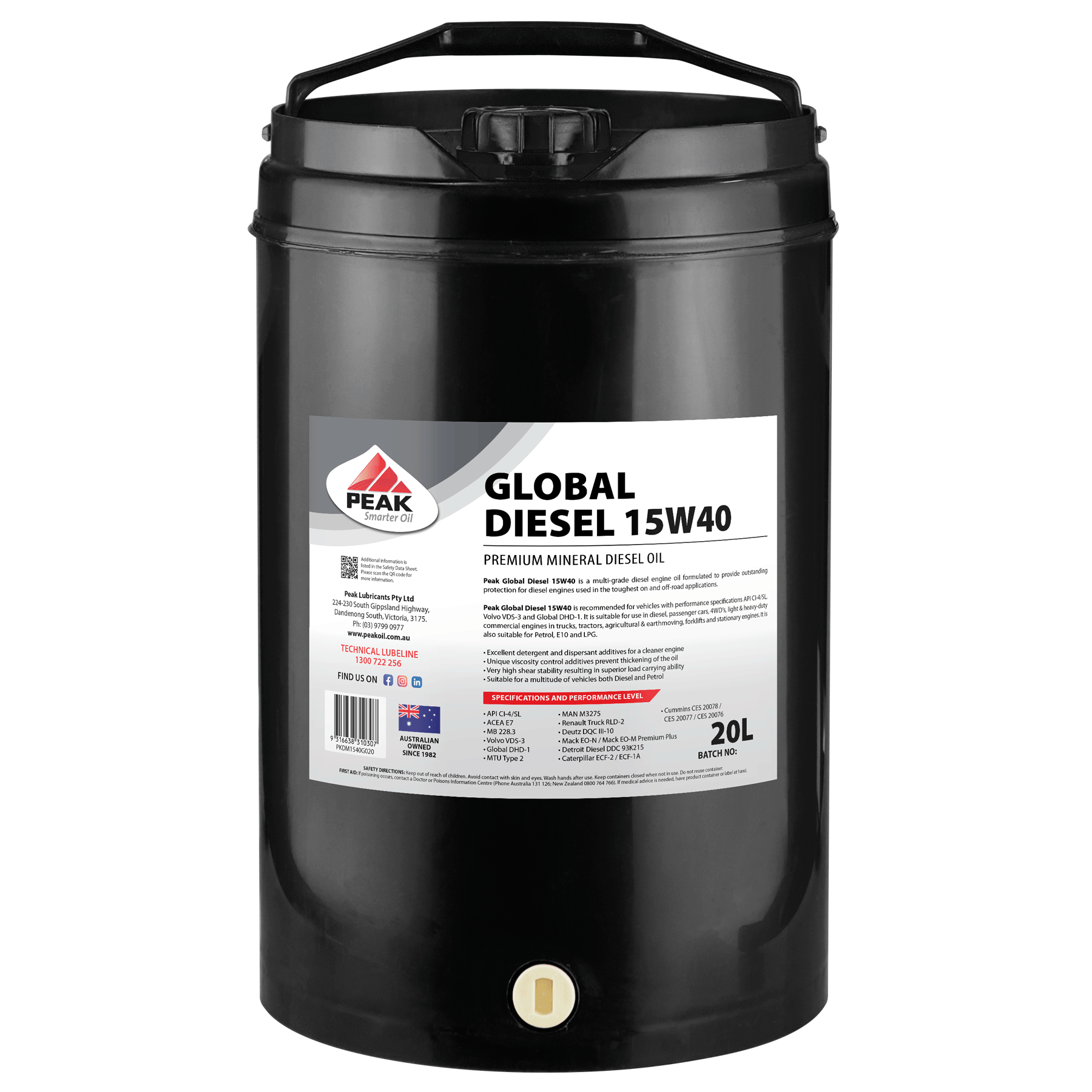 PEAK GLOBAL DIESEL 15W40 is recommended for vehicles with performance specifications API CI-4/SL, Volvo VDS-3 and Global DHD-1. It is suitable for use in diesel, passenger cars, 4WD’s, light & heavy-duty commercial engines in trucks, tractors, agricultural & earthmoving, forklifts and stationary engines. It is also suitable for Petrol, E10 and LPG.