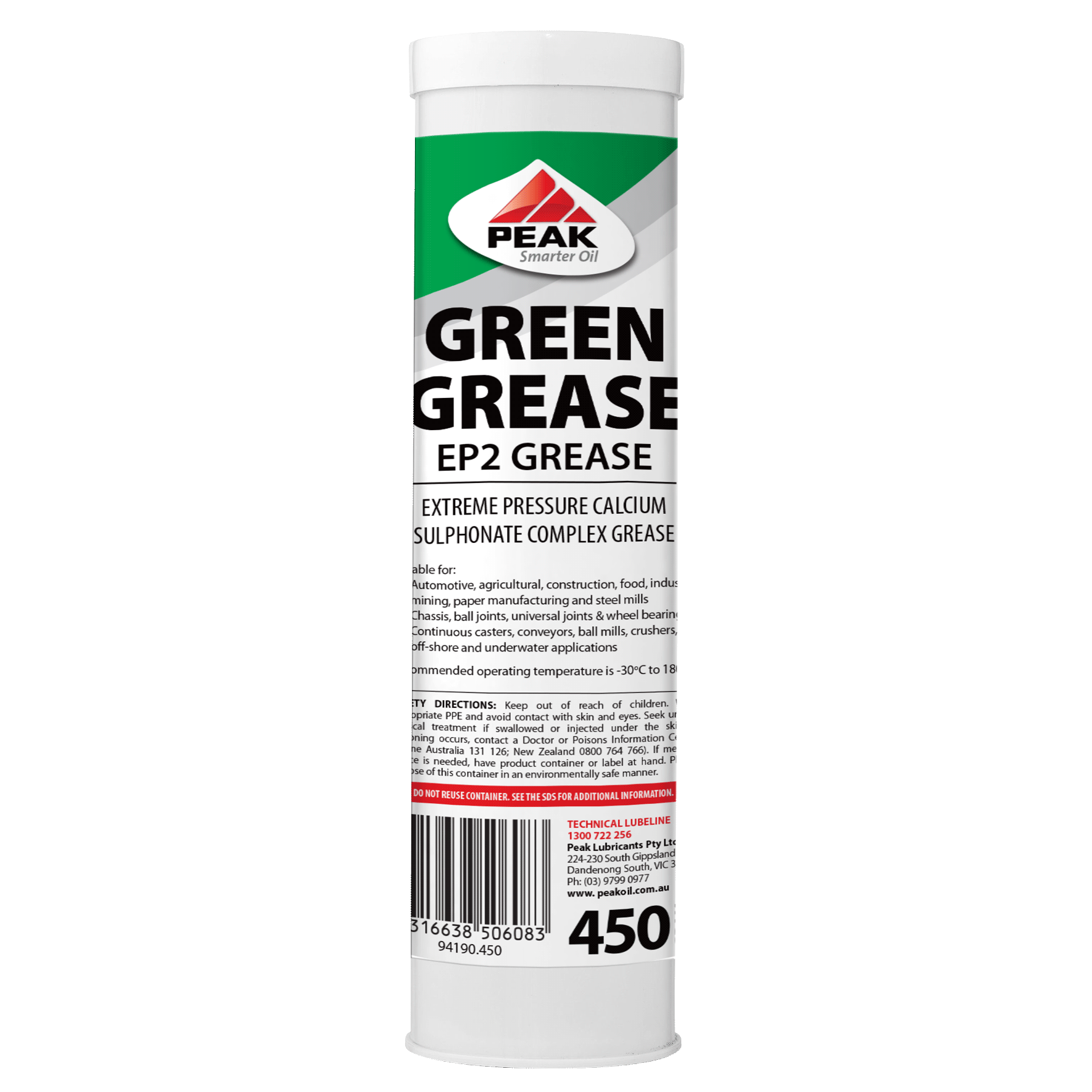 PEAK GREEN GREASE is a premium, multipurpose high temperature Calcium Sulphonate complex NLGI No. 2 grease that is designed to meet the demands of the most hostile grease applications and conditions. Recommended operating temperature is from -30°C to +180°C - however, it is capable of operating at temperatures of between 200°C and 290°C continuously with frequent relubricating. Occasional temperature spikes up to 315°C can be sustained for 5 to 10 minutes without melting or carbonising.