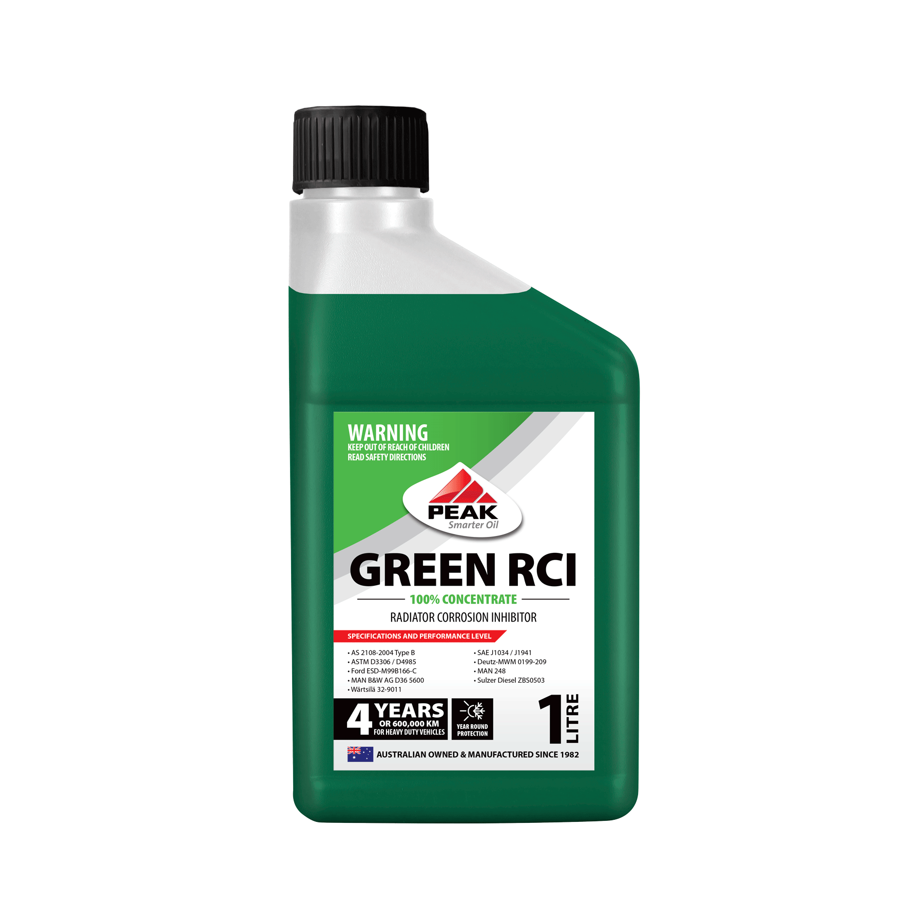 PEAK GREEN RCI CONCENTRATE is a water-based blend of organic acid carboxylates corrosion inhibitors with anti-foaming agents (to prevent foams and water pump cavitation), and anti-scale compounds formulated to provide excellent corrosion and anti-freeze/anti-boil protection for modern cooling systems.