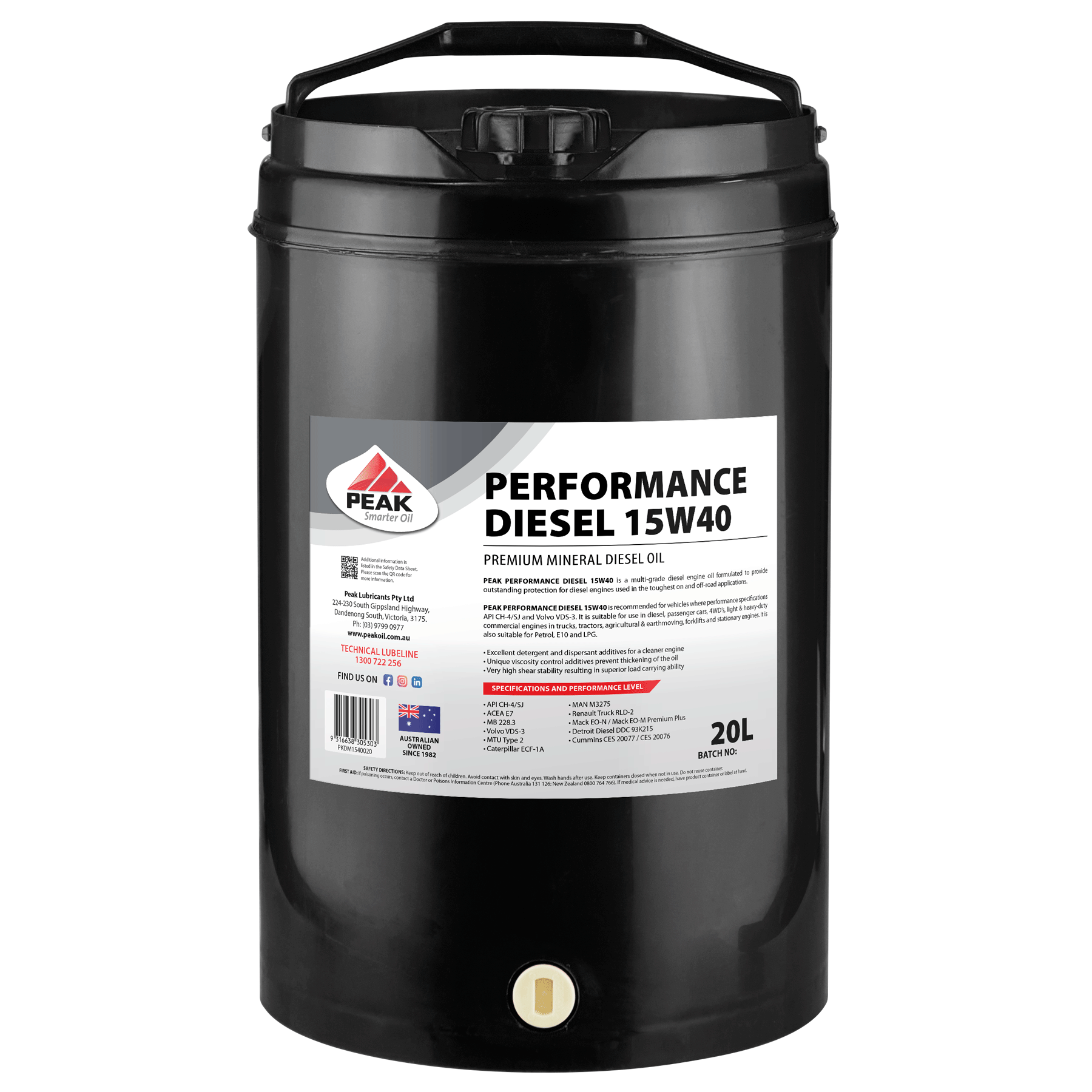 PEAK PERFORMANCE DIESEL 15W40 is recommended for vehicles where performance specifications API CH-4/SJ and Volvo VDS-3. Is suitable for use in diesel, passenger cars, 4WD's, light & heavy-duty commercial engines in trucks, tractors, agricultural & earthmoving, forklifts and stationary engines. It is also suitable for Petrol, E10 and LPG.